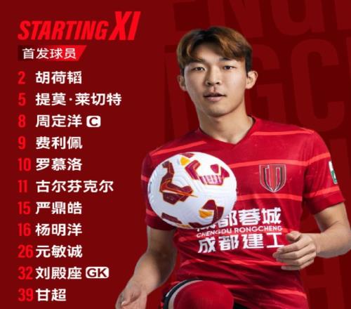 这一轮主场迎战河南队,成都蓉城在首发上派出了32-刘殿座、2-胡荷韬、5-提莫-莱切特(F)、11-古尔芬克尔(F)、26-元敏诚、8-周定洋、10-罗慕洛(F)、15-严鼎皓、16-杨明洋、39-甘超、9-费利佩(F)的阵容。