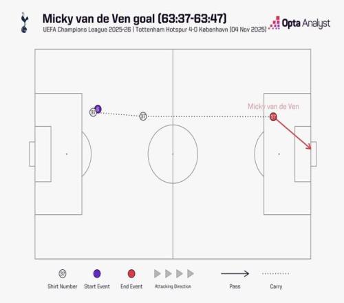 欧冠联赛阶段第四轮,热刺主场4-0大胜哥本哈根,热刺后卫范德芬在下半场长途奔袭打入一球,范德芬带球奔袭距离为67.7米,为有统计以来欧冠最长的奔袭破门距离。