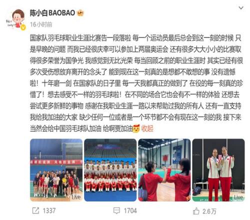 11月24日,在全运会上演生涯最后一舞之后,国羽女双名将陈清晨正式宣布从国家队退役,也就此完结了属于她与贾一凡的双打传奇。